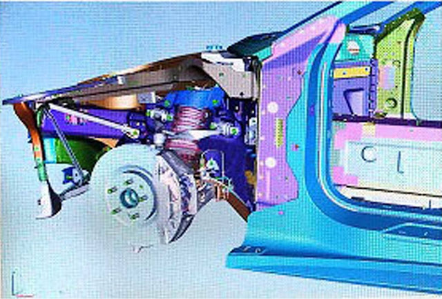 The rear subframe is large and not meant for only holding the suspension like on a traditional unibody chassis. It clearly has engine and transaxle mounts, suggesting that the car might be built around a centre tub or chassis with front and rear subframes bolted to it. It isn't immediately clear from just the CAD images what it will have for rear springs but the structural members and drivetrain near the rear lower control arm/wishbone suggest little room for a transverse leaf spring so this could finally use coil springs all around.